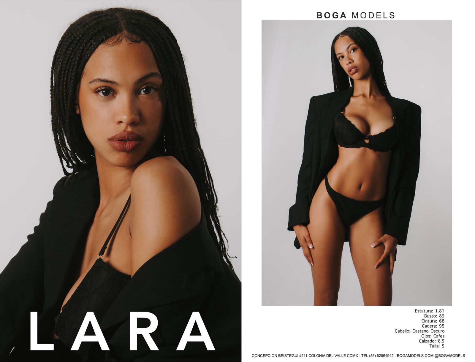 Altura 1.81 | Busto 89 | Cintura 68 | Cadera 95 | Cabello Castaño Oscuro | Ojos Cafés | Calzado 6.5 | Talla 5