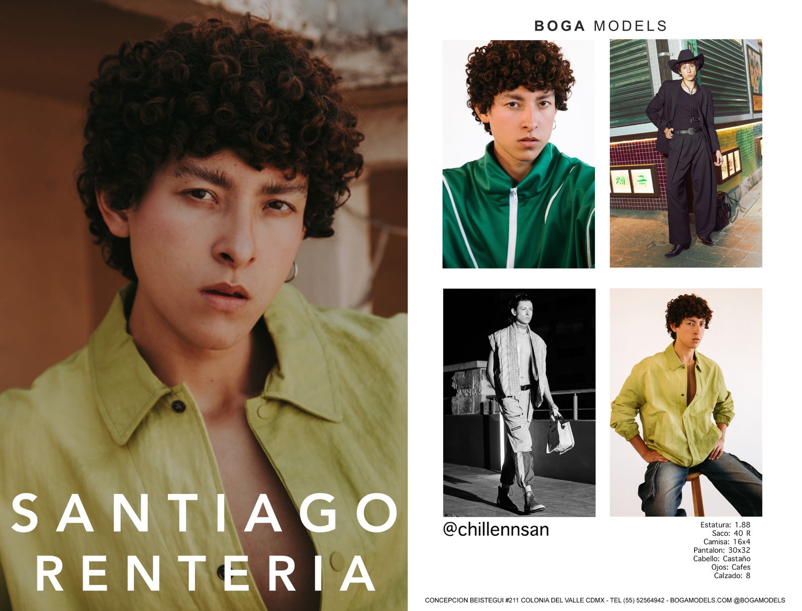 Estatura: 1.88 | Saco: 40R | Camisa: 16×4 | Pantalón: 30×32 | Cabello: Castaño | Ojos: Cafés | Calzado: 8